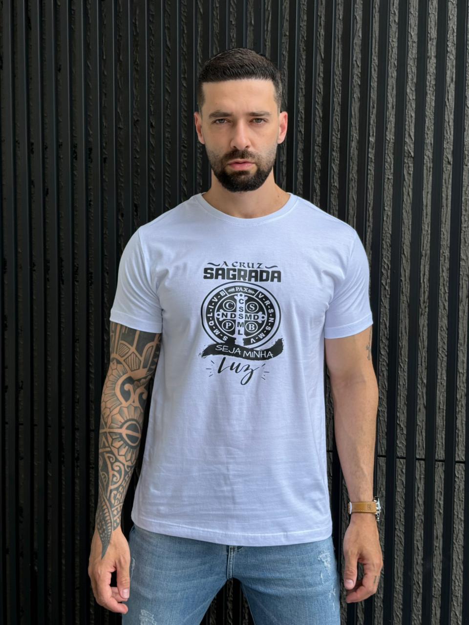 CAMISETA MASCULINA DTF A CRUZ SAGRADA - BRANCO