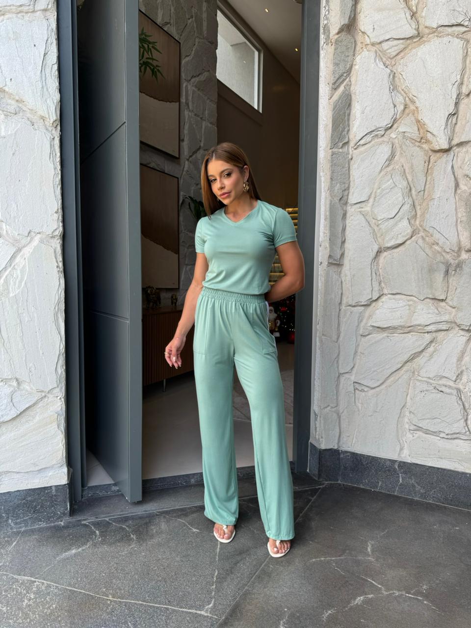 A t-shirt gola V é confeccionada em viscolycra, proporcionando um toque suave e agradável ao corpo, enquanto a saia garante liberdade de movimento, com fenda frontal tornando o conjunto perfeito para o dia a dia ou até para eventos mais casuais e especiais.