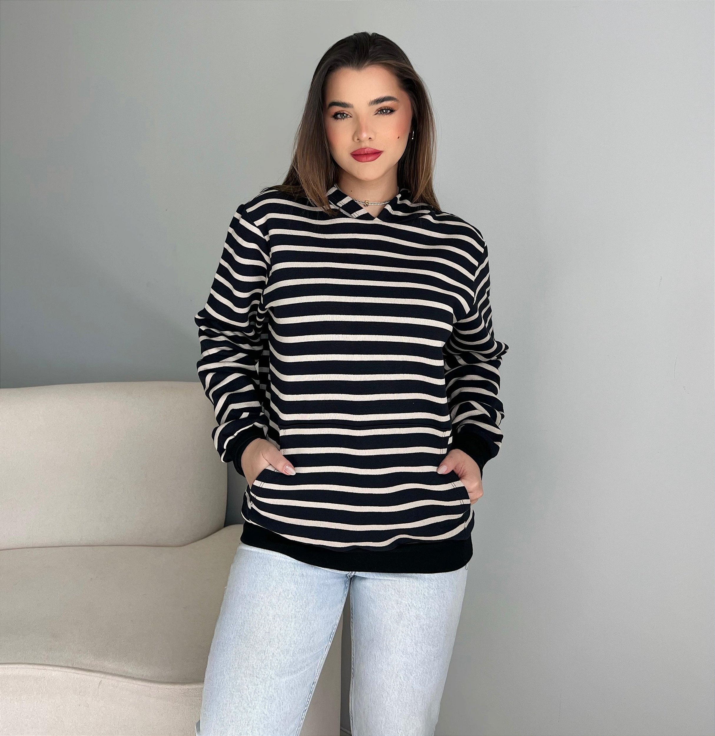 MOLETOM CANGURU LISTRADO - BEGE