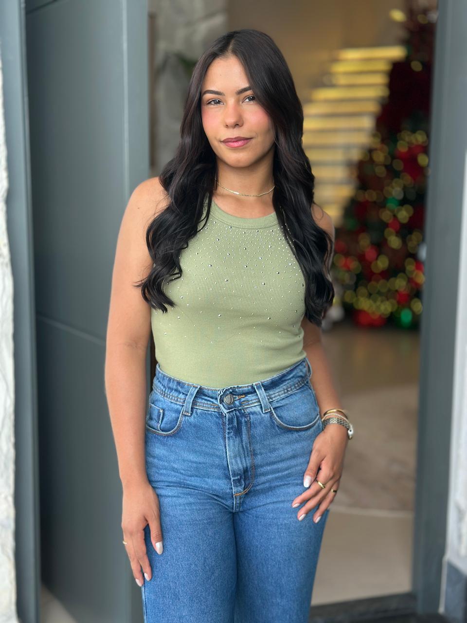 REGATA CANELADA COM STRASS - VERDE OLIVA