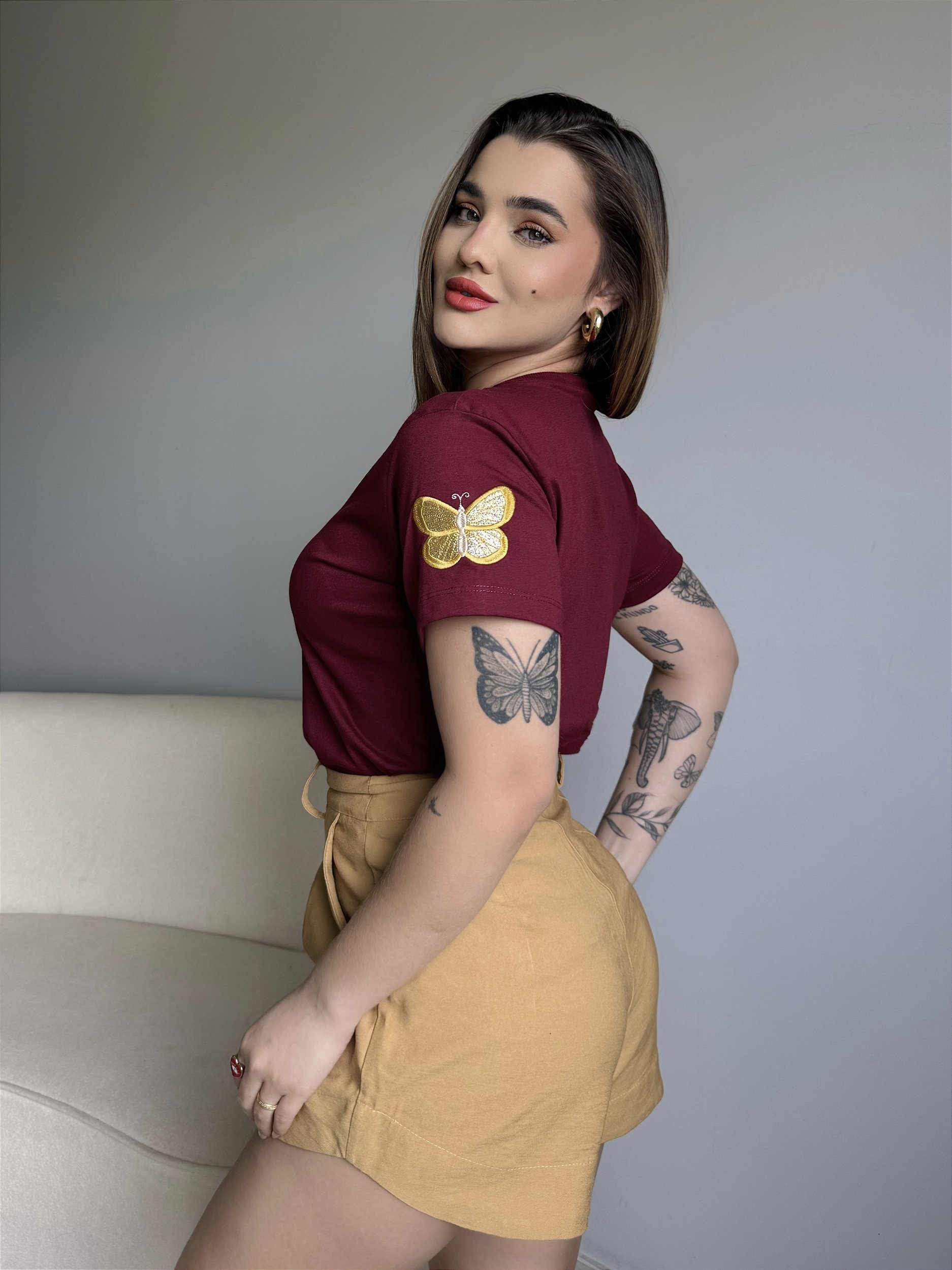 T-SHIRT BORBOLETA BORDADO NA MANGA - BORDO
