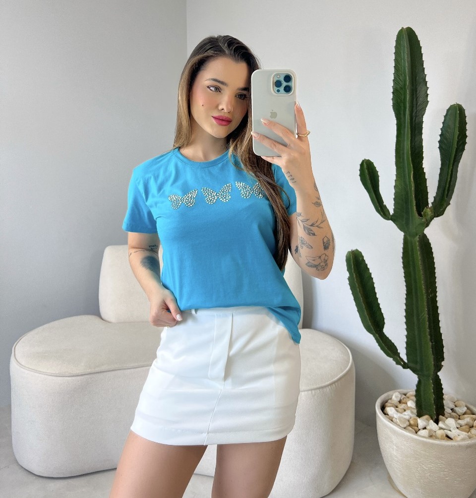 T-SHIRT BORBOLETAS C/STRASS - ACQUA BLUE