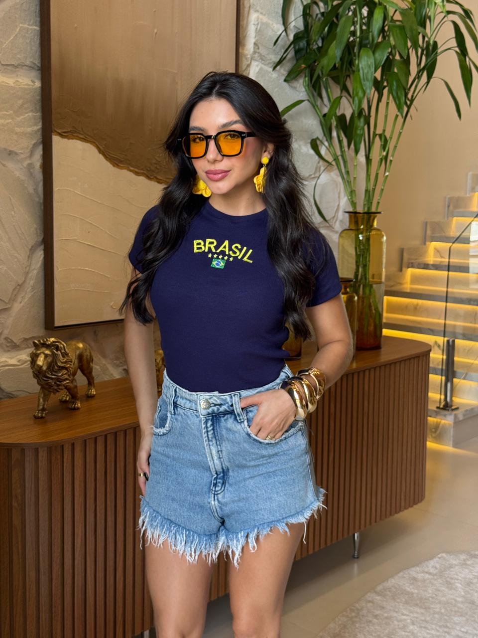 T-SHIRT CANELADA BRASIL (BORDADO) - AZUL MARINHO