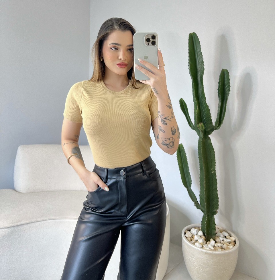 Feito com tecido canelado macio e confortável e modelagem ajustada que valoriza o corpo, permitindo liberdade de movimento.