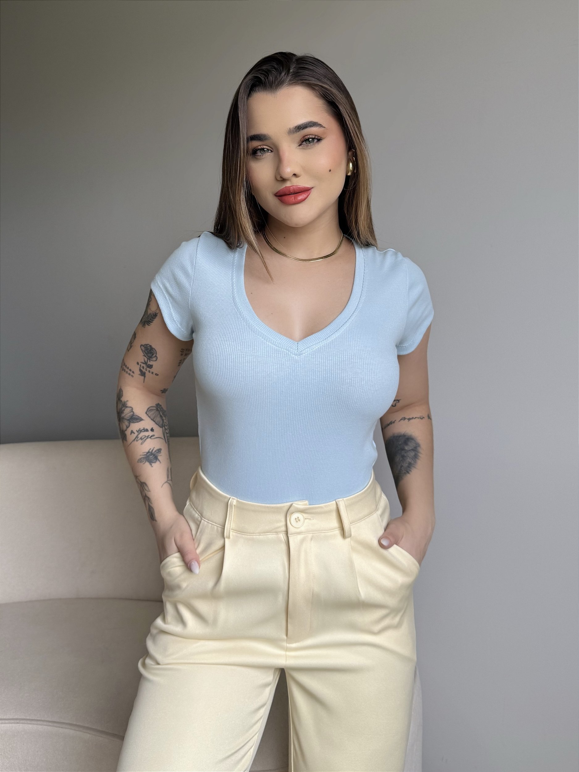 T-SHIRT CANELADA GOLA V - AZUL CÉU