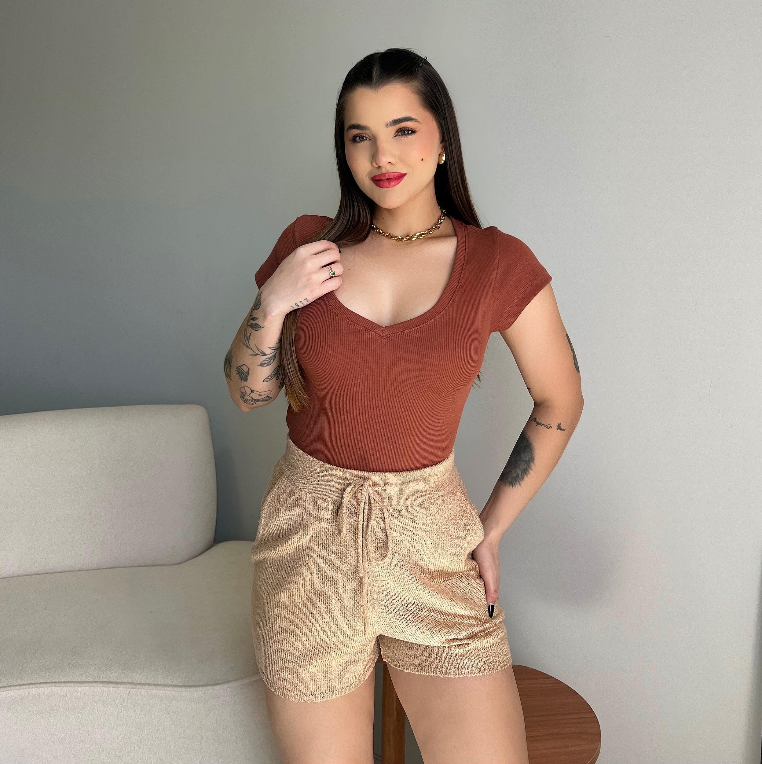 T-SHIRT CANELADA GOLA V - MARROM CHOCOLATE