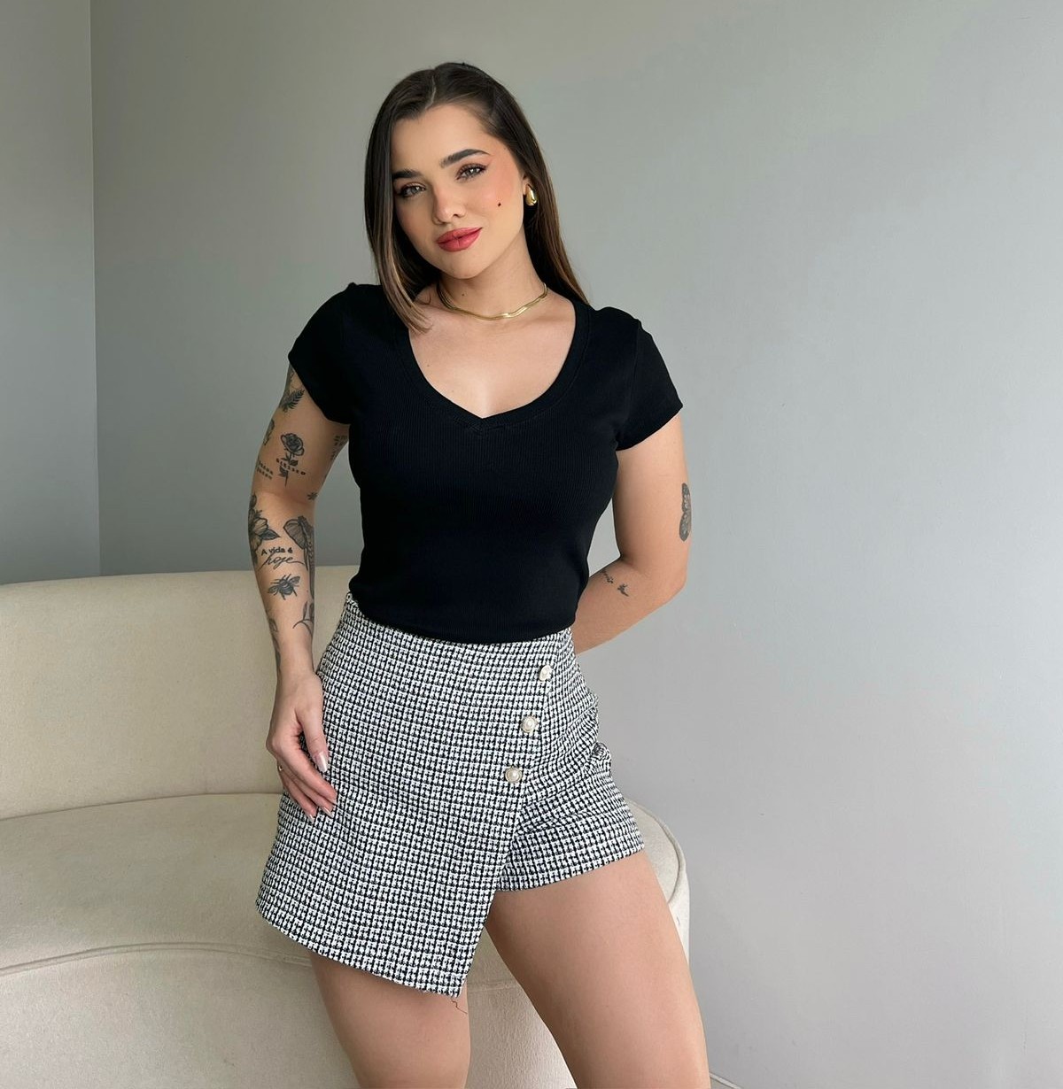 Feito com tecido canelado macio e confortável e modelagem ajustada que valoriza o corpo, permitindo liberdade de movimento.