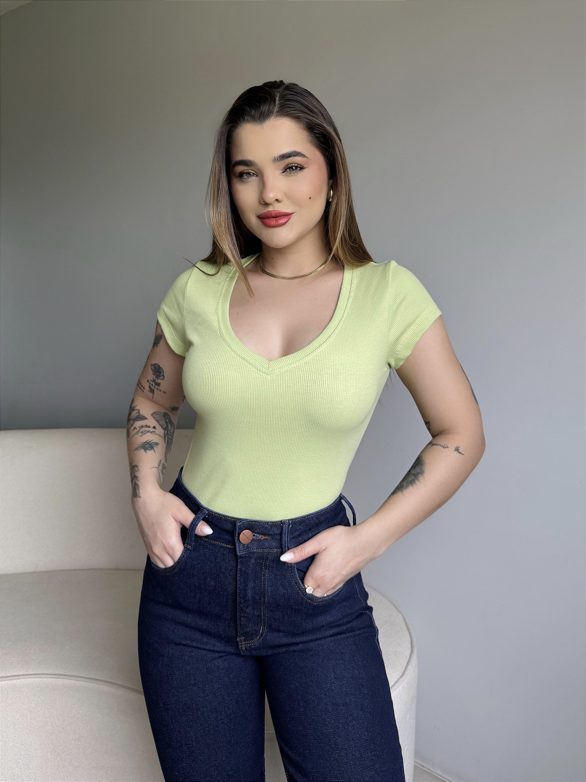 T-SHIRT CANELADA GOLA V - VERDE CREAM