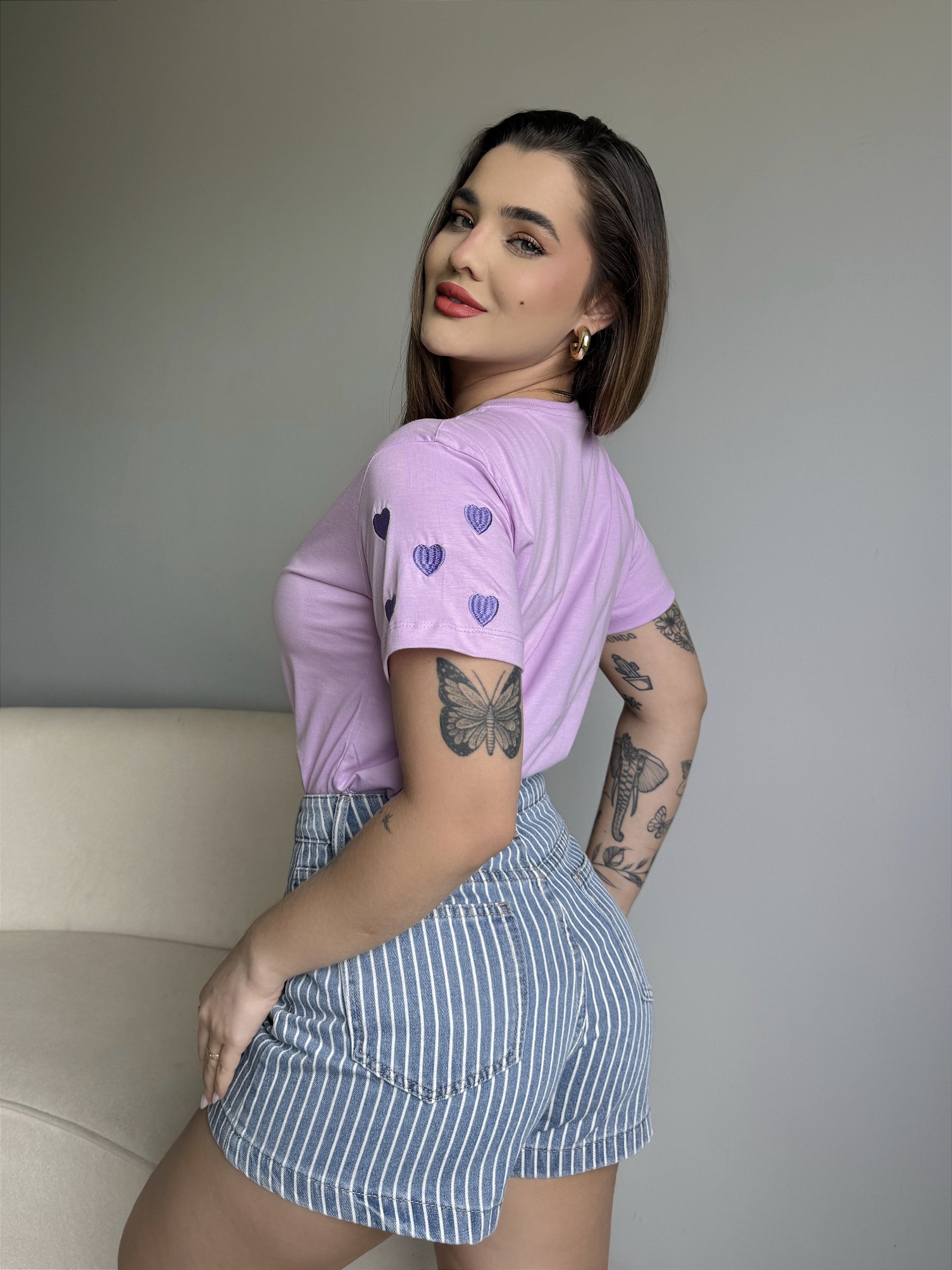 T-SHIRT CORAÇÃO BORDADO NA MANGA - ROXO POESIA