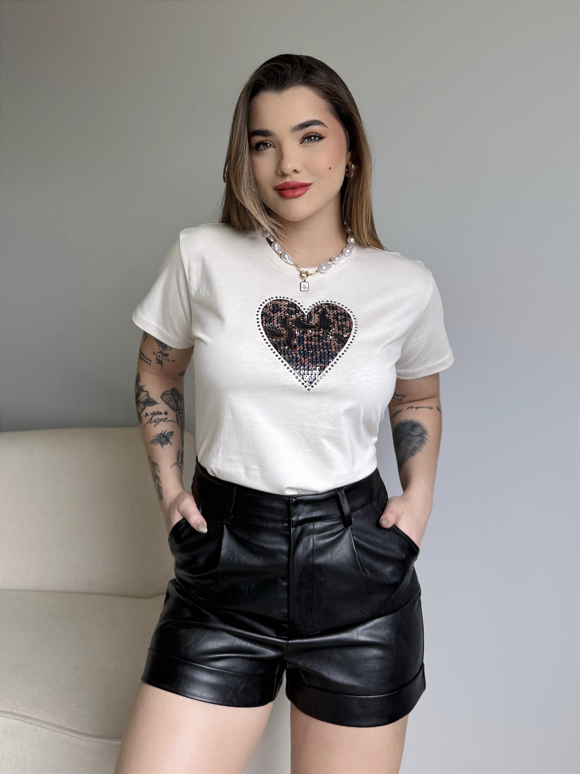 T-SHIRT CORAÇÃO LANTEJOULAS - BEGE NATURAL