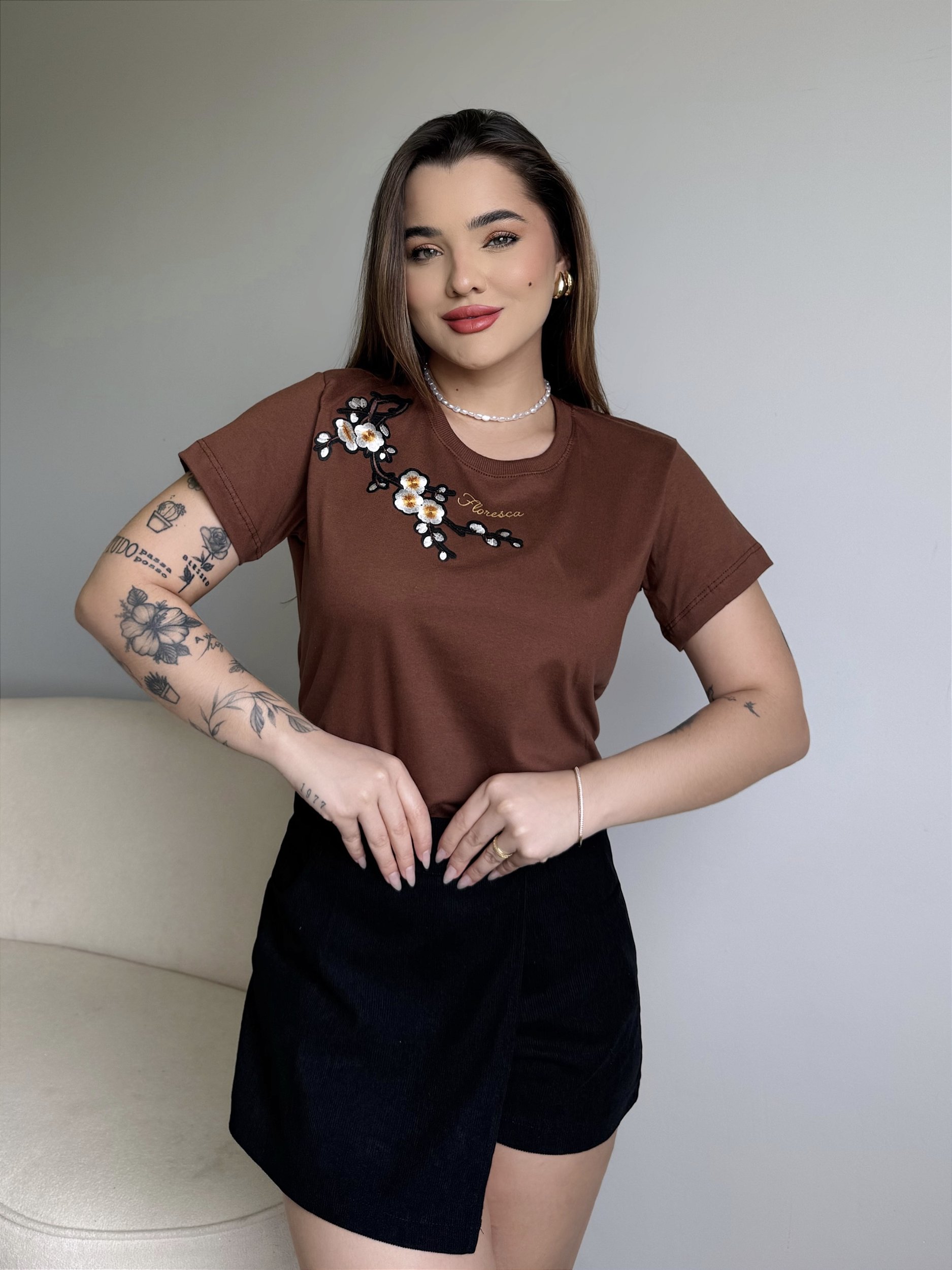 T-SHIRT FLORAL LATERAL FLORESÇA C/APLICAÇÃO - MARROM