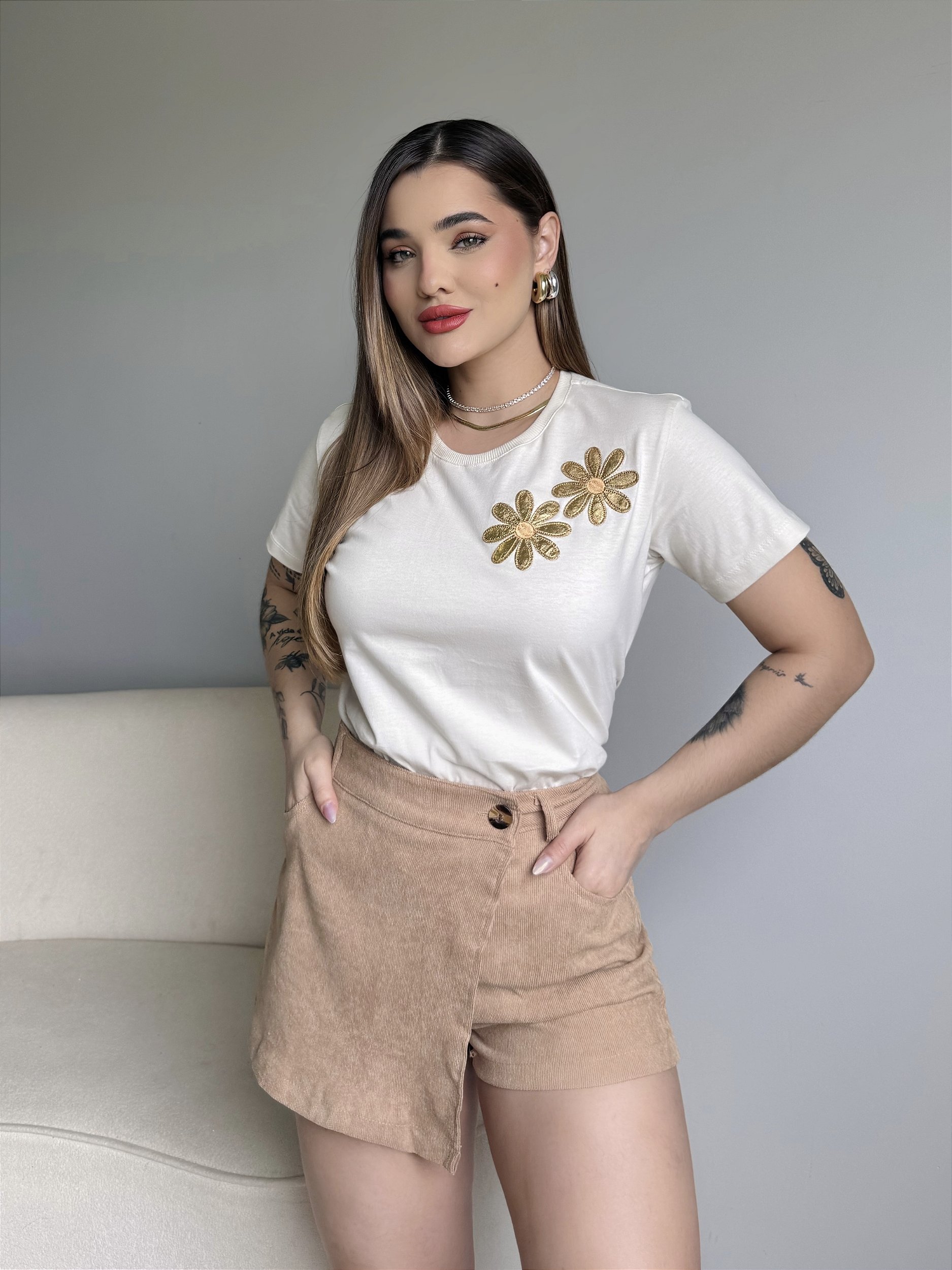 T-SHIRT FLORES NO OMBRO C/APLICAÇÃO - BEGE NATURAL