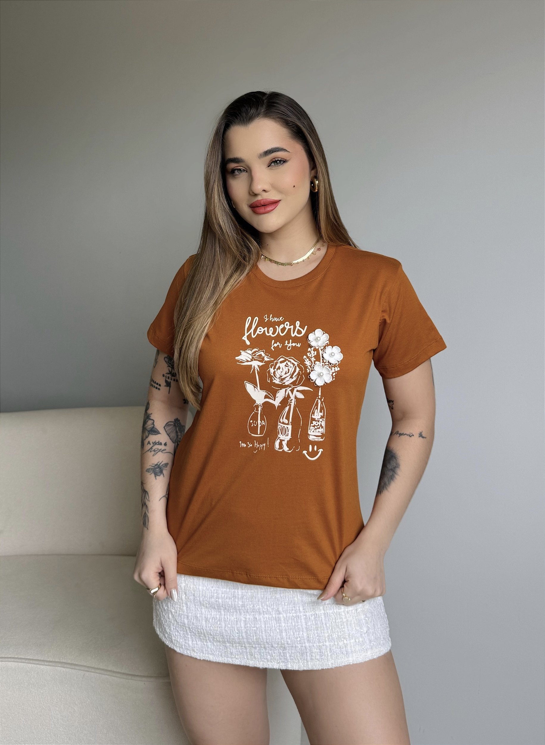 T-SHIRT I HAVE FLOWERS C/APLICAÇÃO - CARAMELO