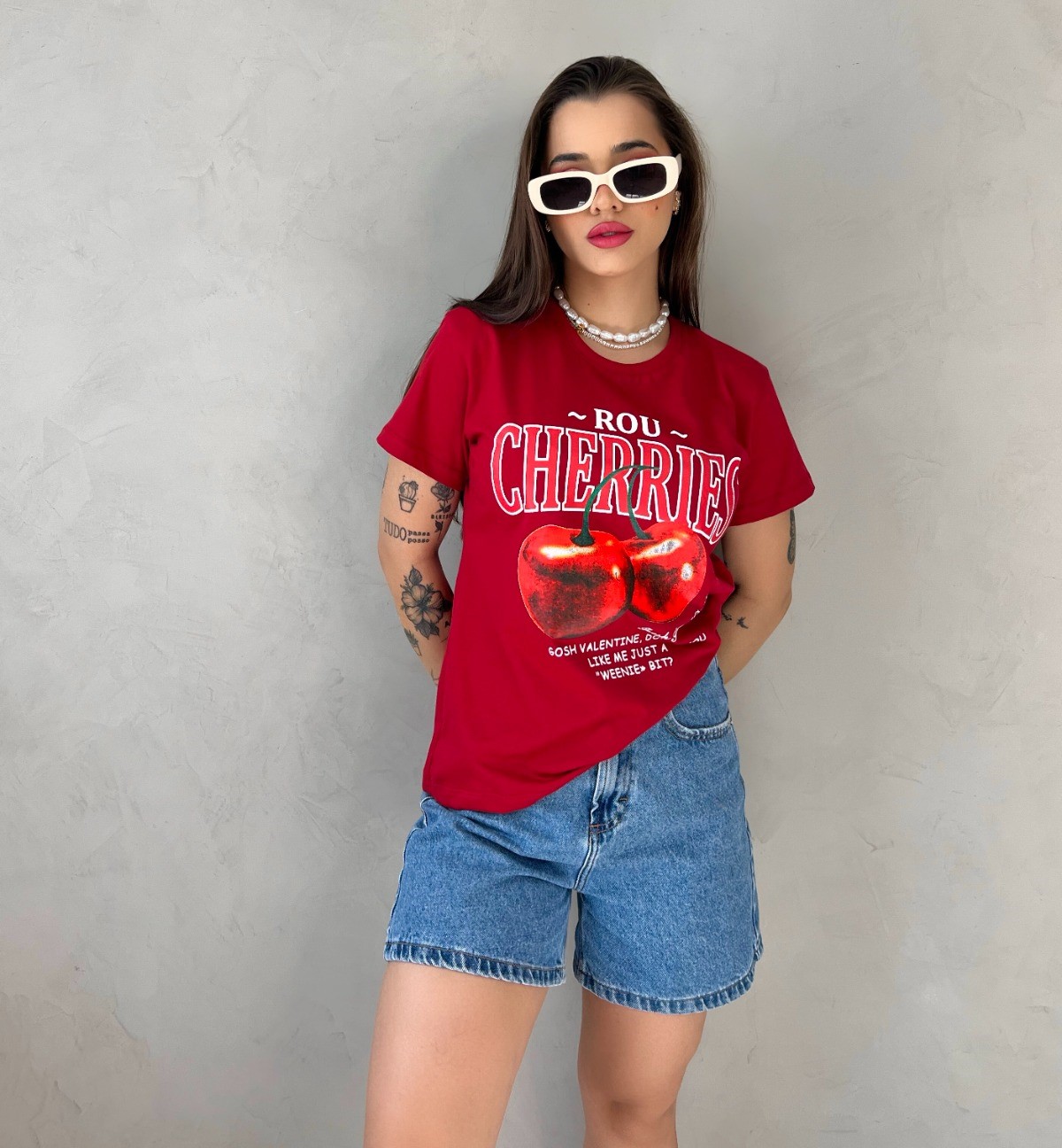 O destaque desta T-shirt é a sua estampa de Cereja vibrante e charmosa, que adiciona um toque de personalidade e alegria ao seu visual. As cerejas são um símbolo de frescor e juventude, tornando esta t-shirt perfeita para os dias ensolarados da primavera e do verão.