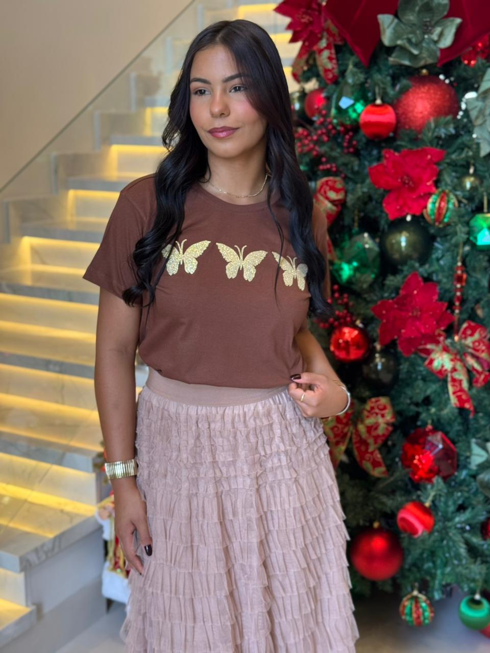 T-SHIRT TRIO BORBOLETAS C/APLICAÇÃO - MARROM